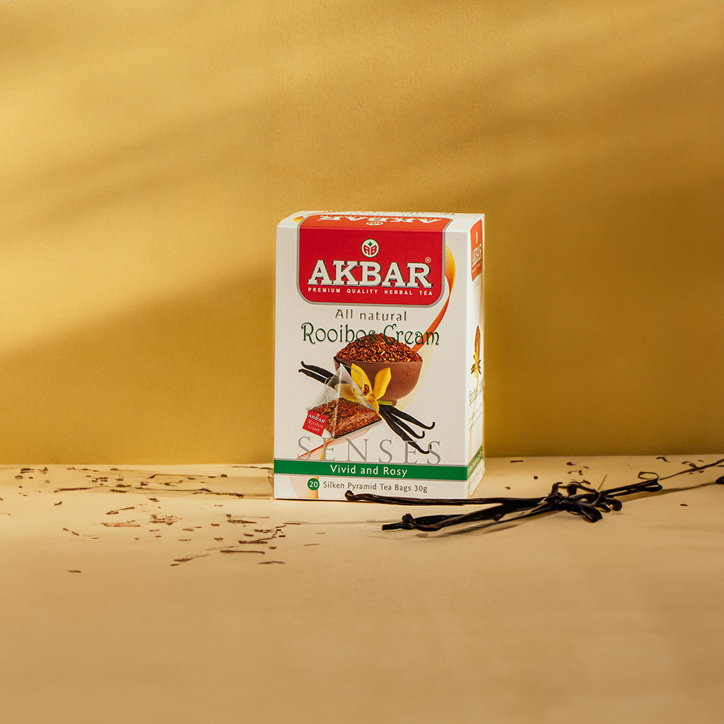Akbar Rooibos Cream Tea is a naturally caffeine-free blend made from South African rooibos, delicately enhanced with smooth vanilla notes for a comforting and creamy infusion.