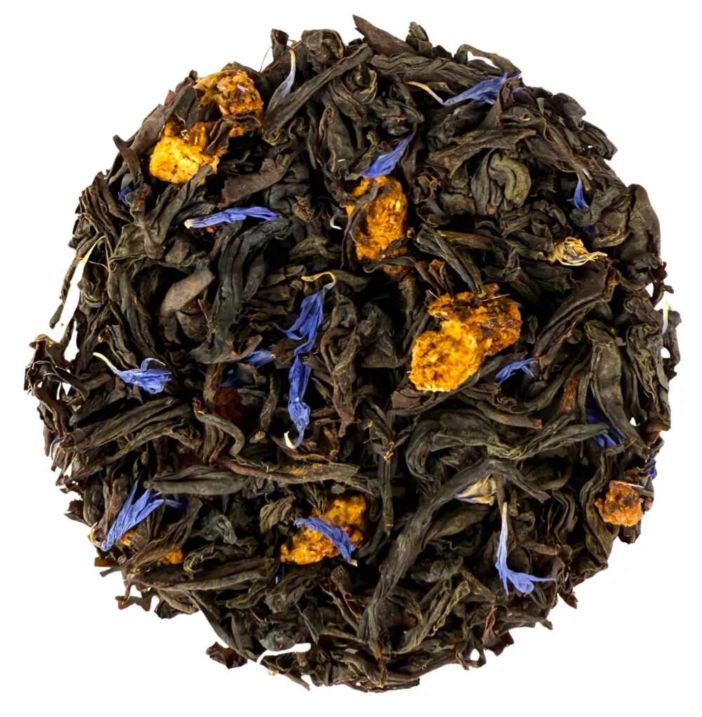 Ingredients: Black tea (85.5%), strawberry (5%), cranberry dices (5%), blueberry (2%), natural mixed-berry flavouring (1.5%), blue cornflower (1%). May contain traces of nuts.