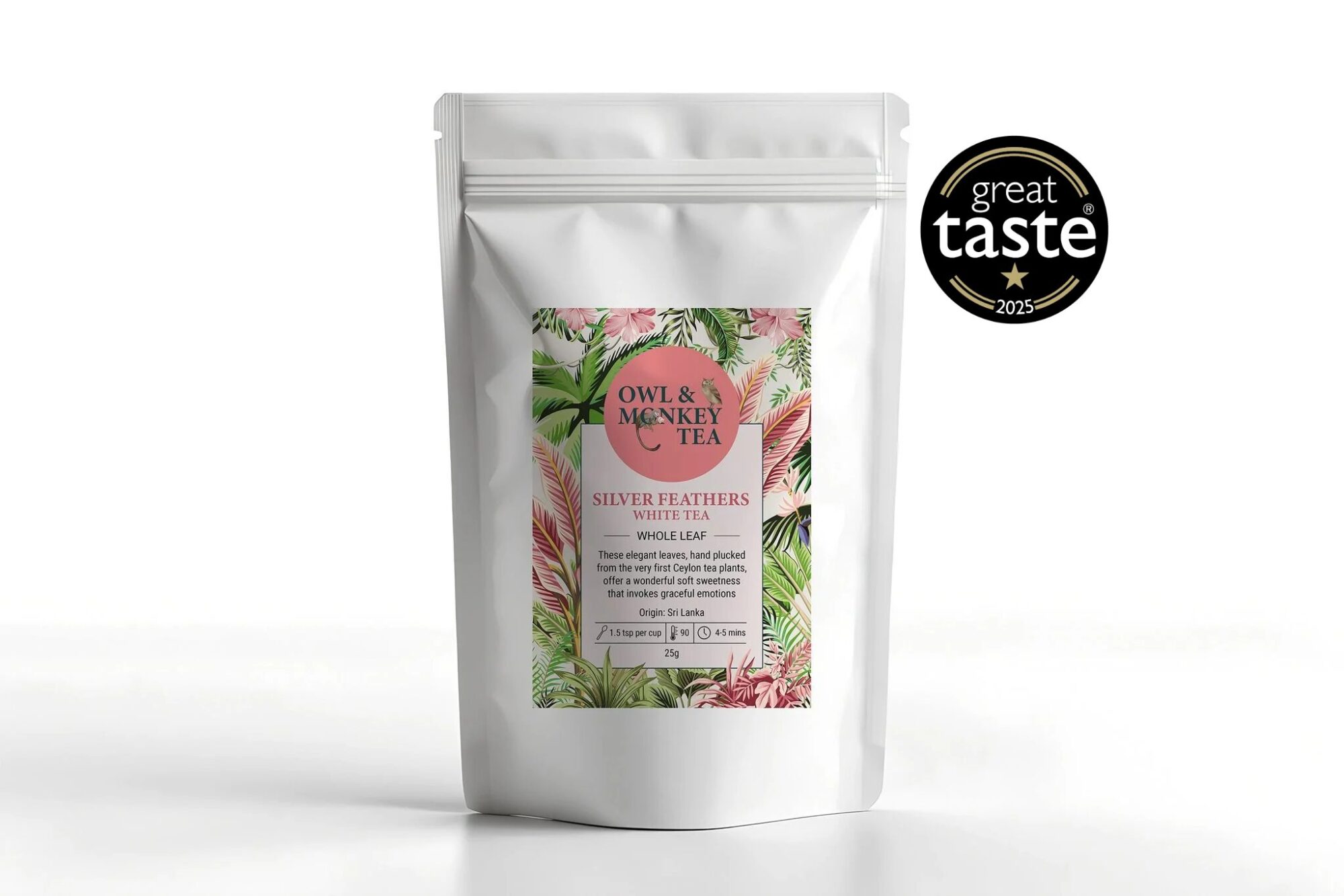 The rare and refined Silver Feathers leaves are picked and prepared according to traditional Sri Lankan methods. This illustrious tea originates from the first tea plants grown in Sri Lanka nearly 200 years ago. Only 8 of these original plants remain today, and it is these plants that produce Owl & Monkey Silver Feathers tea.